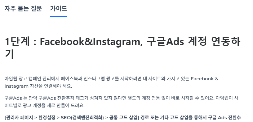 - 아임웹에서 생성한 광고 계정은 아임웹의 자산으로, 고객은 각 채널 광고 관리 페이지 접근이 불가합니다.