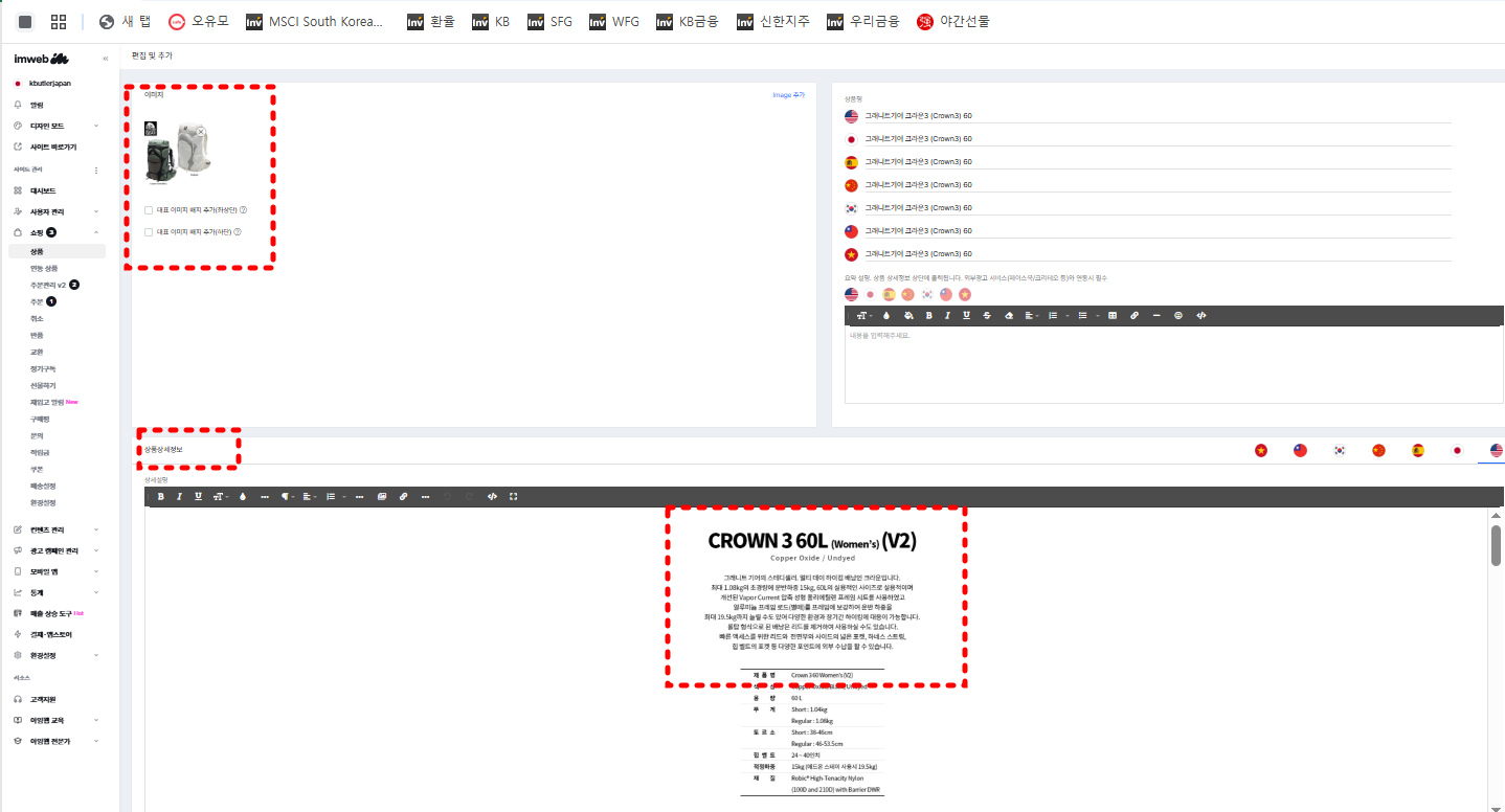 각 언어별 사이트마다 다른 언어로 상품 정보가 입력되어야 하는 점을 고려하여 각각의 언어별 사이트의 상품 요약 정보 및 상세 정보를 입력할 수 있도록 구분되어 있습니다.