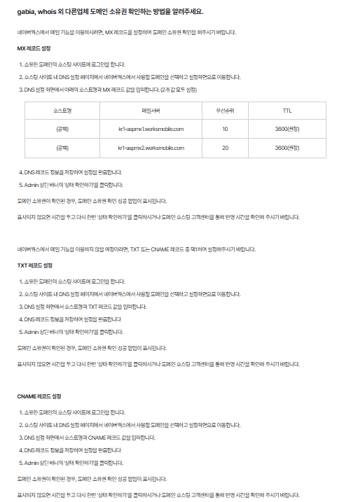 아래 이미지 1은 네이버웍스에서 보조도메인 등록시 도메인 소유권이 확인안된다는 내용입니다. 그리고 이미지 2는 소유권확인 방법을 네이버웍스에서 설명한 내용입니다.