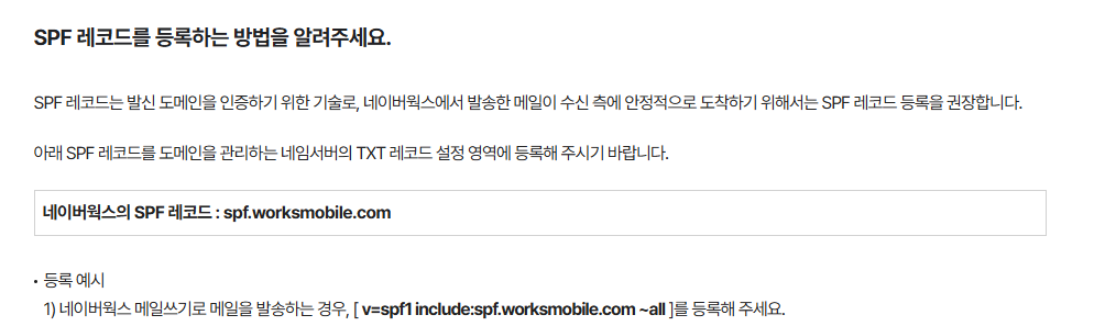 아래 이미지 1은 네이버웍스에서 SPF연동되지 않는 다는 내용입니다. 그리고 이미지 2는 SPF등록 방법을 네이버웍스에서 설명한 내용입니다.